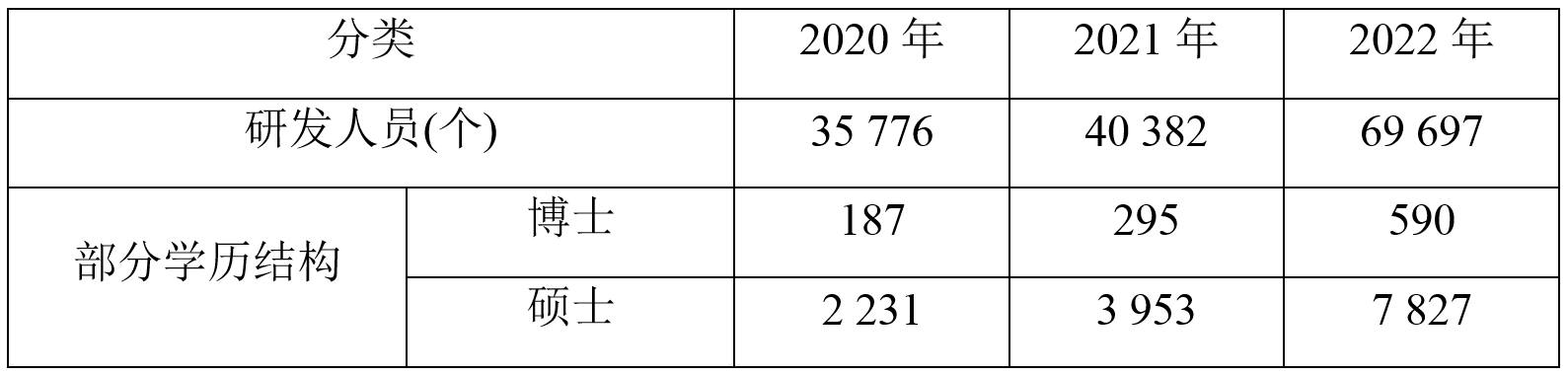 (2024·浙江舟山期中)2023年7月,我国某汽车公司在巴西设立大型生产基地综合体,总投资约45亿元人民币。生产基地将由三座工厂组成:主营电动客车、卡车底盘的生产工厂,新能源乘用车整车生产工厂,以及专门从事磷酸铁锂电池材料的加工工厂。读“2020~2023年该公司研发人员构成表”,完成以下各题。