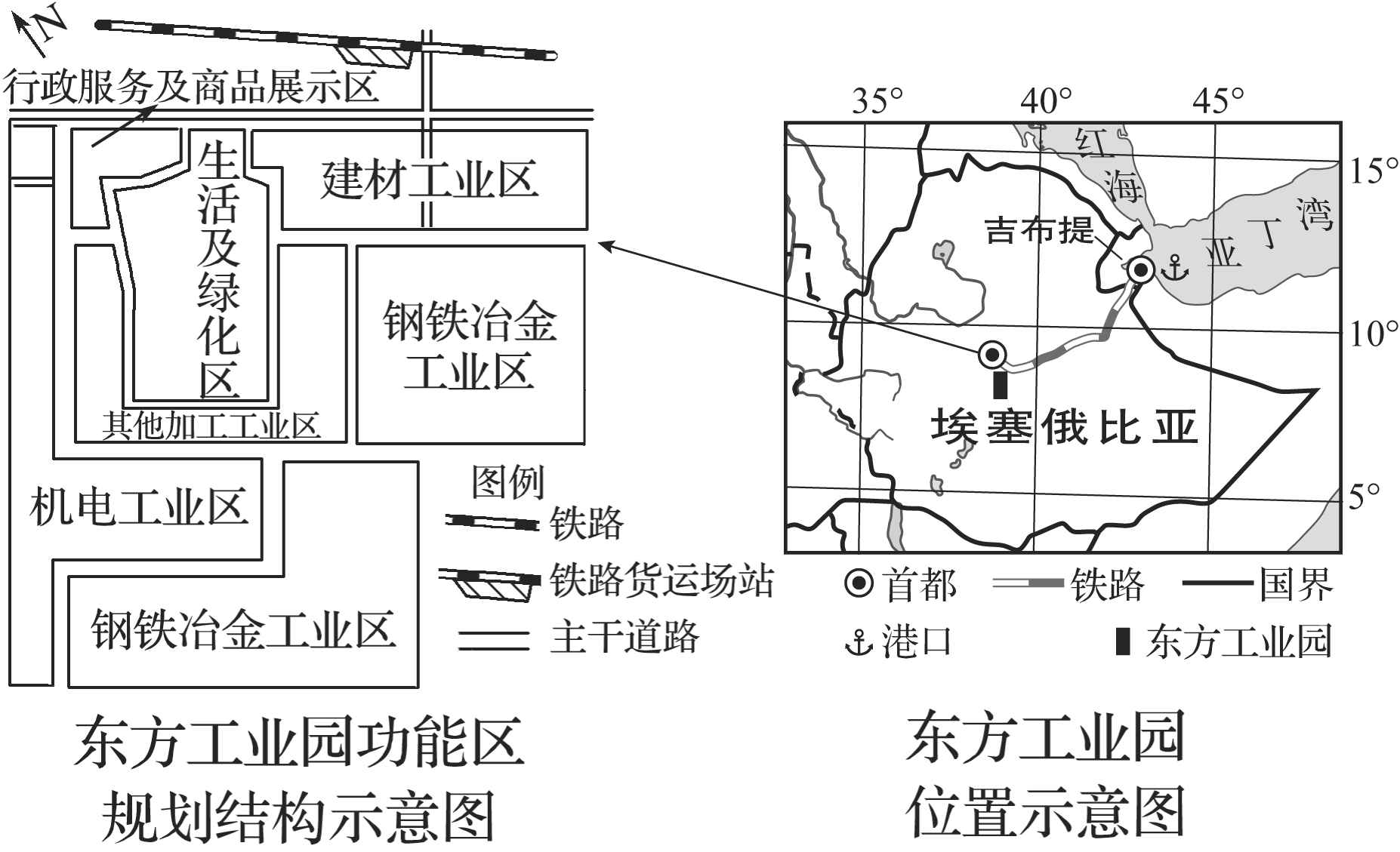 中国在埃塞俄比亚投资建设的东方工业园位于其首都东南30km处(下图),地处高原中的河谷地区,以偏北风为主,园区附近有大量的湖泊和丰富的地下水资源,区内土地原为平整的农用耕地。目前园区有20多家来自中国的企业,主要从事水泥生产、制鞋、汽车组装、钢材轧制、纺织服装等行业,园区工人大部分来自当地,管理人员、工业设备及配件大部分来自中国,产品远销欧美等地。