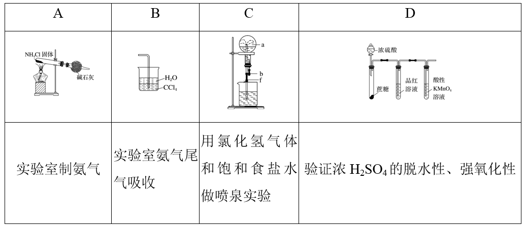 氨气难溶于四氯化碳,B装置能防止倒吸,能达到目的;氯化氢气体易溶于饱和食盐水,用氯化氢气体和饱和食盐水做喷泉实验,C装置能达到目的;浓H2SO4滴到蔗糖上,蔗糖变黑,说明浓硫酸具有脱水性,品红溶液褪色,说明炭和浓硫酸反应生成二氧化硫,说明浓硫酸具有强氧化性,D装置能达到目的。