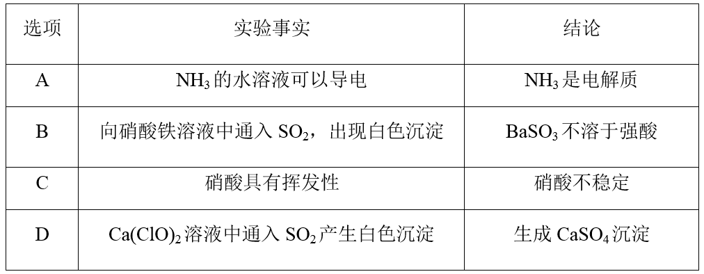 氨本身不电离,溶于水生成的NH3·H2O可电离,NH3是非电解质,A错误;SO2通入硝酸钡溶液,发生氧化还原反应,生成的BaSO4不溶于强酸,B错误;硝酸具有挥发性,不能得出硝酸不稳定,C错误。