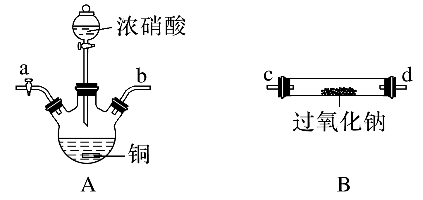 (1)仪器A中,铜和浓硝酸反应制取NO2,用盛水的洗气瓶除去挥发的HNO3并将生成的NO2转化为NO,在盛有浓硫酸的洗气瓶中将NO干燥,通入玻璃管中与过氧化钠反应,后接盛有浓硫酸的洗气瓶防止后续装置中水蒸气进入玻璃管,最后用盛有酸性高锰酸钾溶液的烧杯吸收未反应完的NO,防止污染空气,故仪器按气流方向连接顺序为b→g→h→e→f→c(d)→d(c)→e→f→i。(2)空气中的CO2、H2O会和Na2O2反应,氧气则会把产品中的NaNO2氧化成NaNO3,故反应开始前打开活塞a,通入过量氮气排尽装置中的空气,反应结束后打开活塞a,继续通入过量氮气,将整个装置中残留的NO全部排入酸性高锰酸钾溶液中吸收,防止污染空气。(4)Na2O2为淡黄色固体,而NaNO2为白色固体,故判断Na2O2已被NO反应完全的现象是装置B中淡黄色固体完全变为白色。(5)依据电子守恒,酸性KMnO4和NaNO2的关系为2KMnO4~5NaNO2,则发生反应的n(NaNO2)=n(KMnO4)×=16×10-3 L×0.1 mol·L-1×=0.004 mol,则样品中NaNO2的质量:m(NaNO2)=0.004 mol×10×69 g·mol-1=2.76 g,则NaNO2的纯度为×100%=92%。