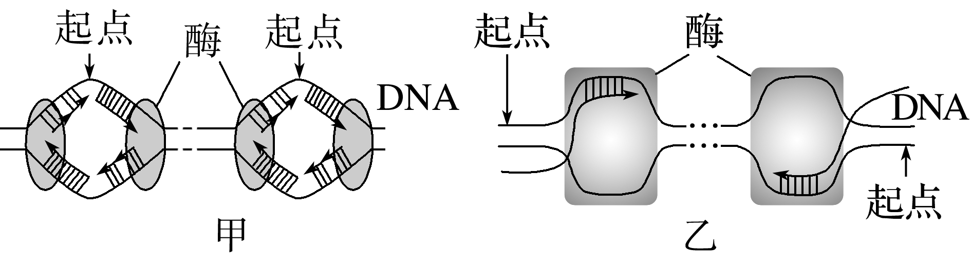甲、乙两图表示真核细胞内两种物质的合成过程,下列叙述正确的是