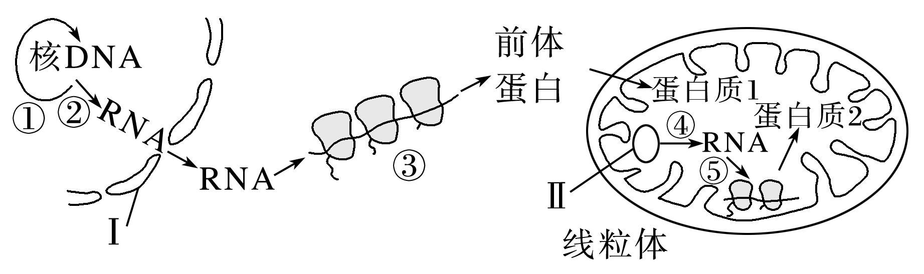 (2024·台州高一期中)某细胞中有关物质合成如图,①~⑤表示生理过程,Ⅰ、Ⅱ表示结构或物质。据图分析,下列叙述错误的是