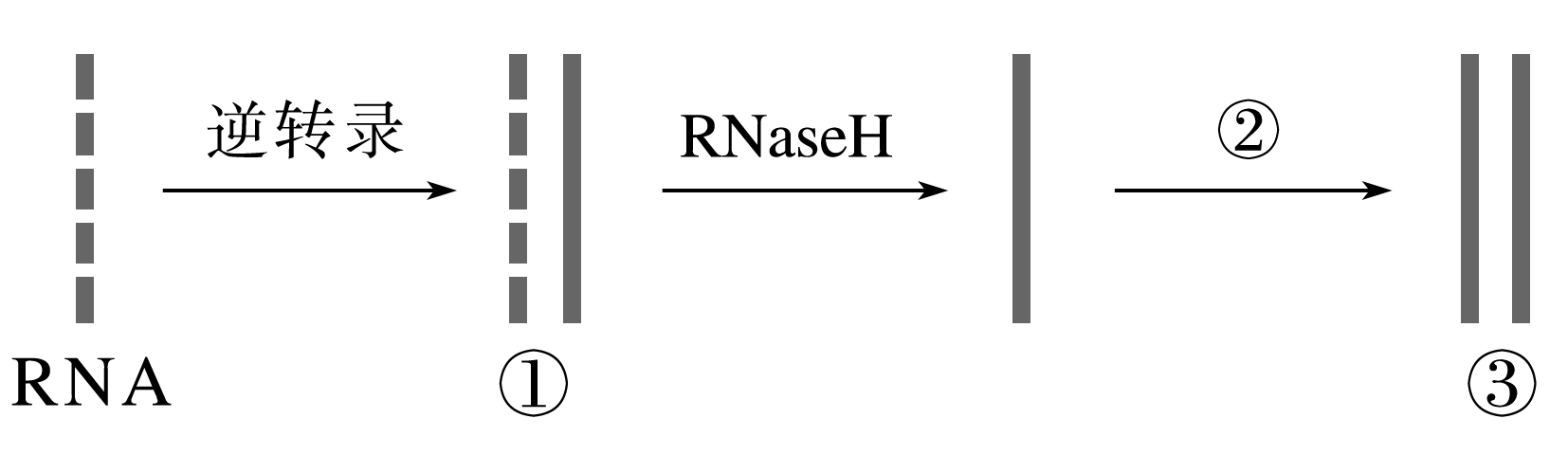 ①表示杂交双链,一条为DNA链,另一条为RNA链,即①为DNA-RNA杂交链,A正确;①为DNA-RNA杂交链,RNaseH的作用是特异性地催化特定核酸链降解,只剩下一条DNA链,B正确;②过程通过DNA单链形成双链DNA分子,不需要加入解旋酶,C错误。
