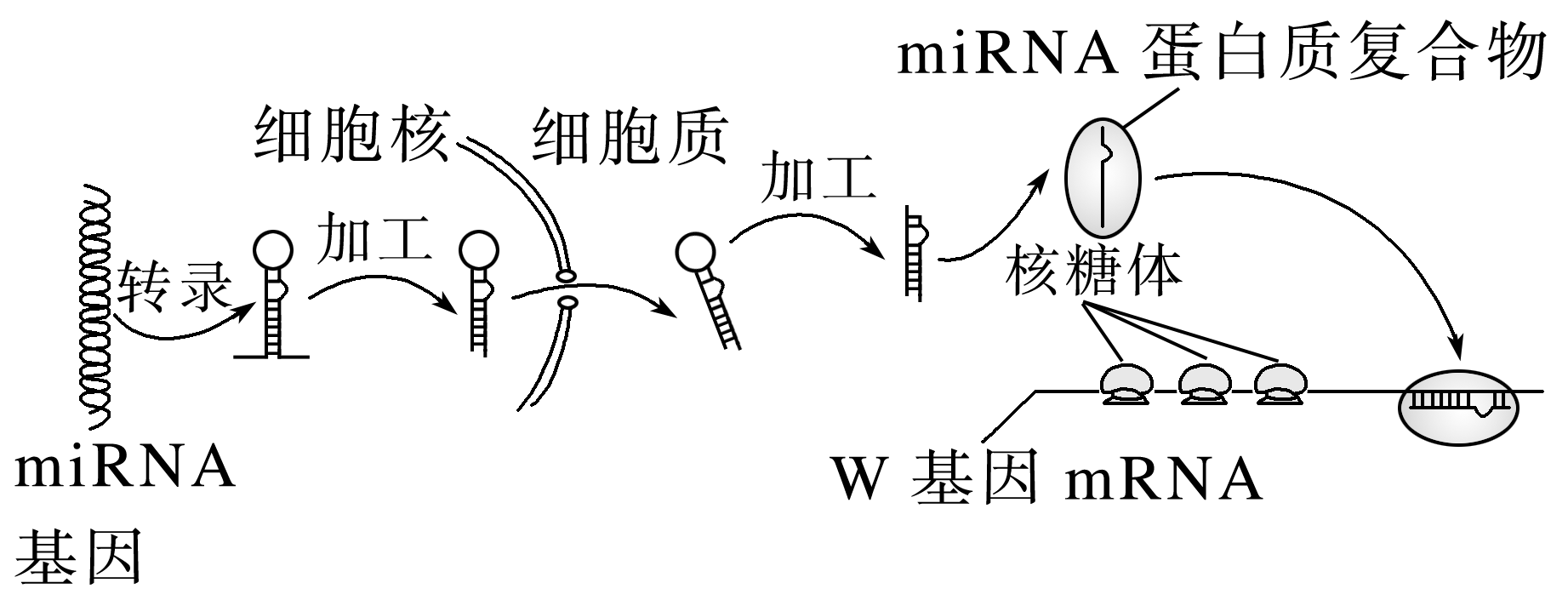 miRNA抑制W蛋白的合成通过miRNA蛋白质复合物与W基因mRNA结合,阻止核糖体移动,从而使W蛋白合成过程提前终止,B正确;miRNA基因在细胞核中转录形成后要进行加工,然后通过核孔进入细胞质中再次加工并发挥作用,C错误;miRNA、rRNA、mRNA、tRNA都属于RNA,都是以DNA为模板转录而来的,D正确。