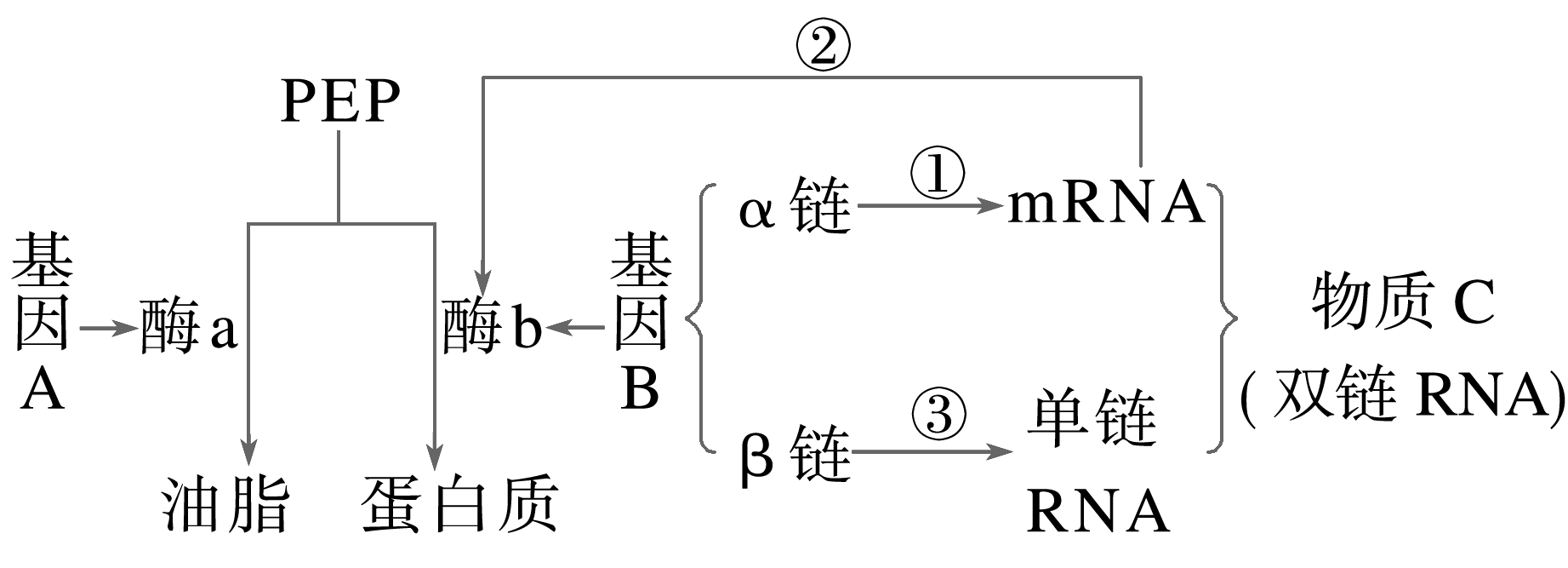 (2024·宁波高一期末)PEP为油菜细胞中的一种中间代谢产物,在两对独立遗传的等位基因A/a、B/b的控制下,可转化为油脂或蛋白质。某科研组研究出产油率更高的油菜品种,基本原理如图所示。下列分析正确的是