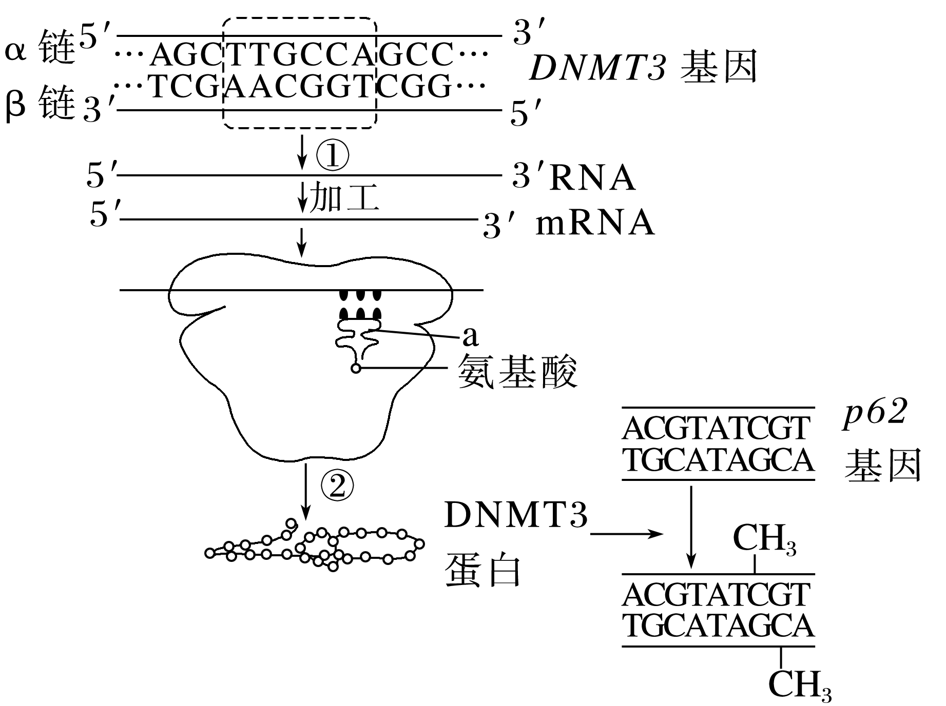 (2)与DNMT3基因启动部位结合的酶是____________,若以β链为模板,则该酶在β链上的移动方向为________,虚线框中的DNA片段对应的RNA碱基序列为______________。RNA在________内加工成为成熟的mRNA后移动到细胞质,当核糖体遇到mRNA中的____________便开始过程②,最终得到有活性的DNMT3蛋白。