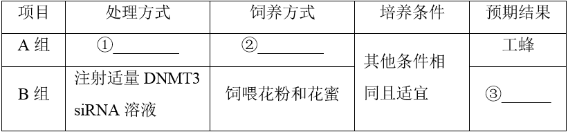 (5)已知注射DNMT3 siRNA(小干扰RNA)能抑制DNMT3基因表达,为验证DNMT3蛋白是决定雌蜂幼虫发育成工蜂或蜂后的关键因素,科研人员取多只生理状况相同的幼虫,平均分为A、B两组,请根据提示完成表中内容。