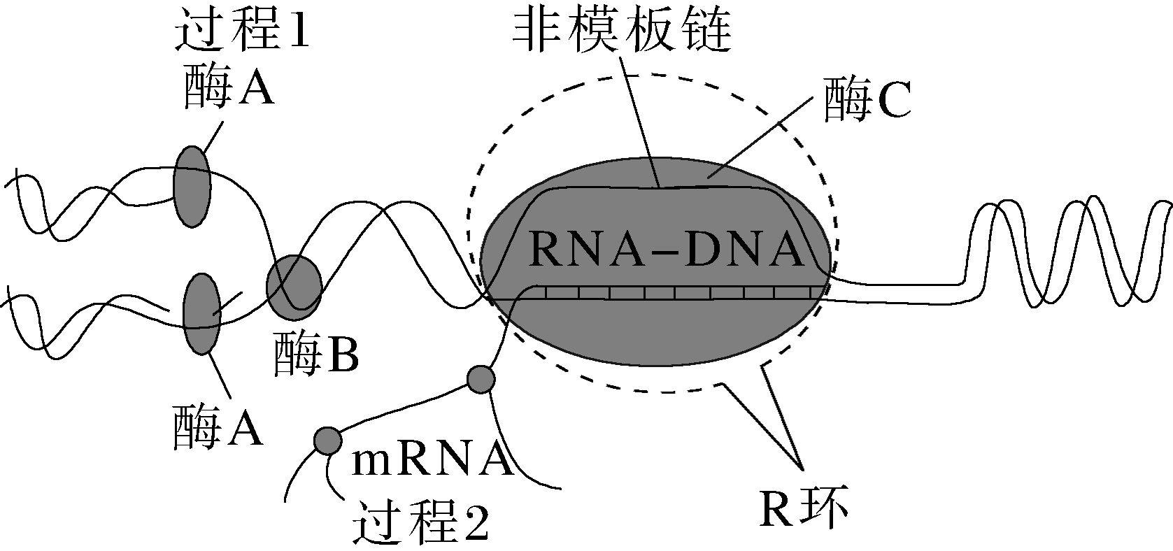 当某些基因转录形成的mRNA分子难与模板链分离时,会形成RNA-DNA杂交体,这时RNA-DNA杂交体、非模板链共同构成R环结构。R环结构会对DNA复制产生不利影响。如图为某细胞遗传信息的传递和表达过程的示意图。下列说法错误的是
