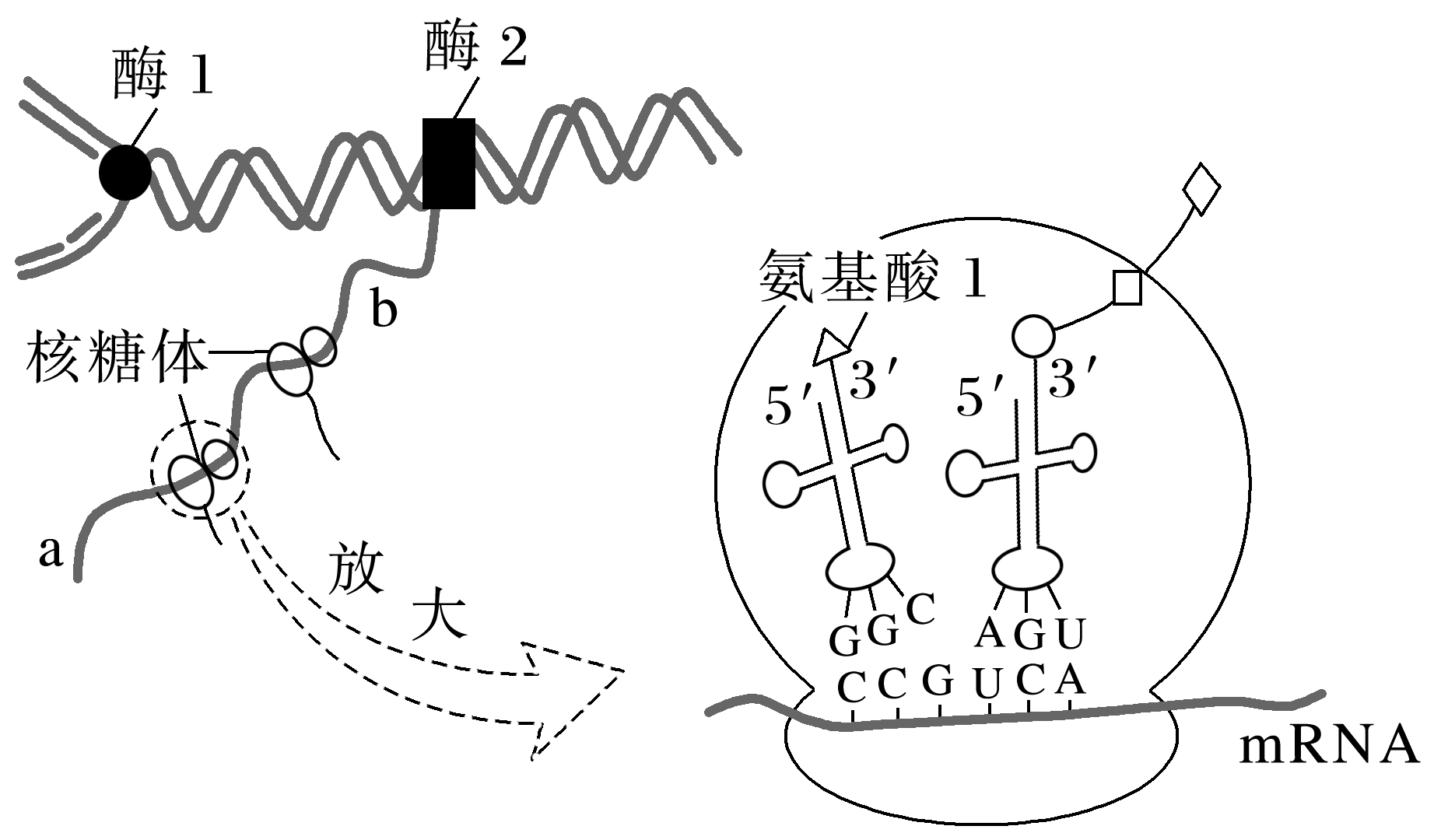 图中显示了DNA复制、转录和翻译过程,其中酶1为解旋酶,酶2为RNA聚合酶,A正确;核糖体在mRNA上从a→b移动,进而合成了多肽链,B错误;密码子是由mRNA上的三个相邻的碱基组成的,一个密码子能决定一个氨基酸,结合图示可以看出,决定氨基酸1的密码子是GCC,C正确;图中所示的生物转录和翻译同时、同地进行,因而该生物为原核生物,D正确。