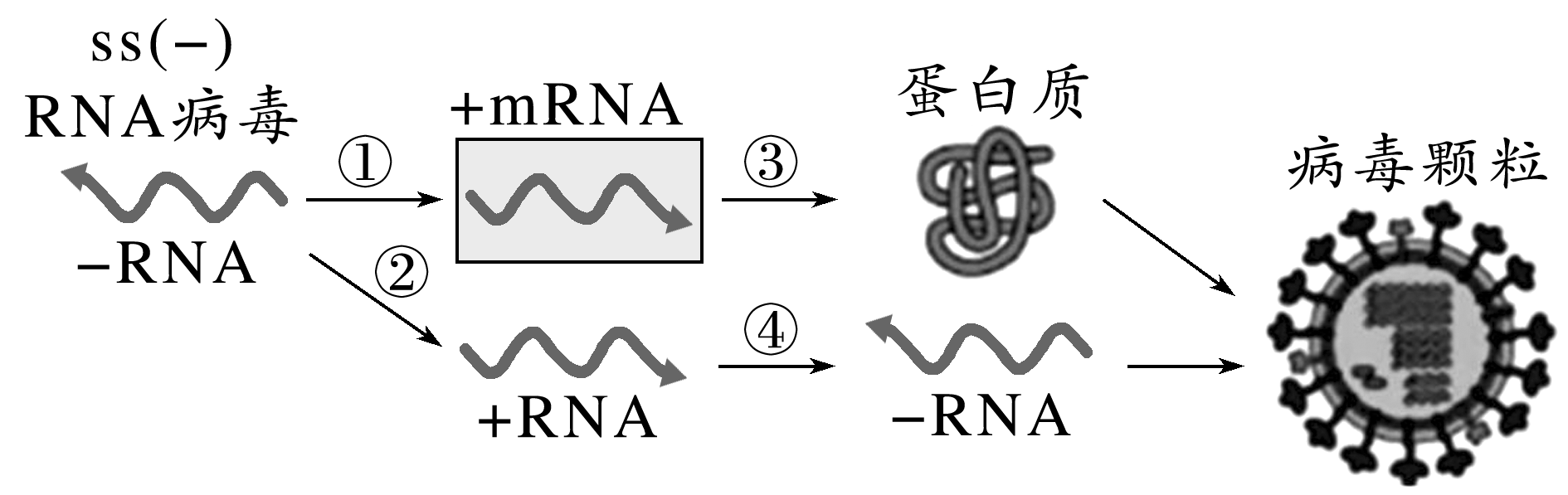 埃博拉病毒是一种能引起人类和其他灵长类动物产生出血热的烈性传染病病毒,属于单股负链RNA病毒,其复制如图所示:以负链RNA为模板,在自身携带的酶的催化下,发生复制并翻译7种蛋白质,最终与负链RNA组装成完整的病毒颗粒。