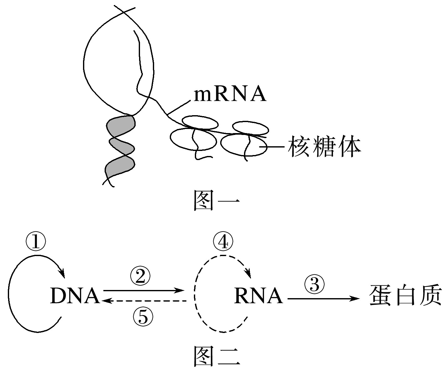 图一为细胞中遗传信息的表达过程,图二表示遗传信息的传递途径。下列叙述错误的是( )