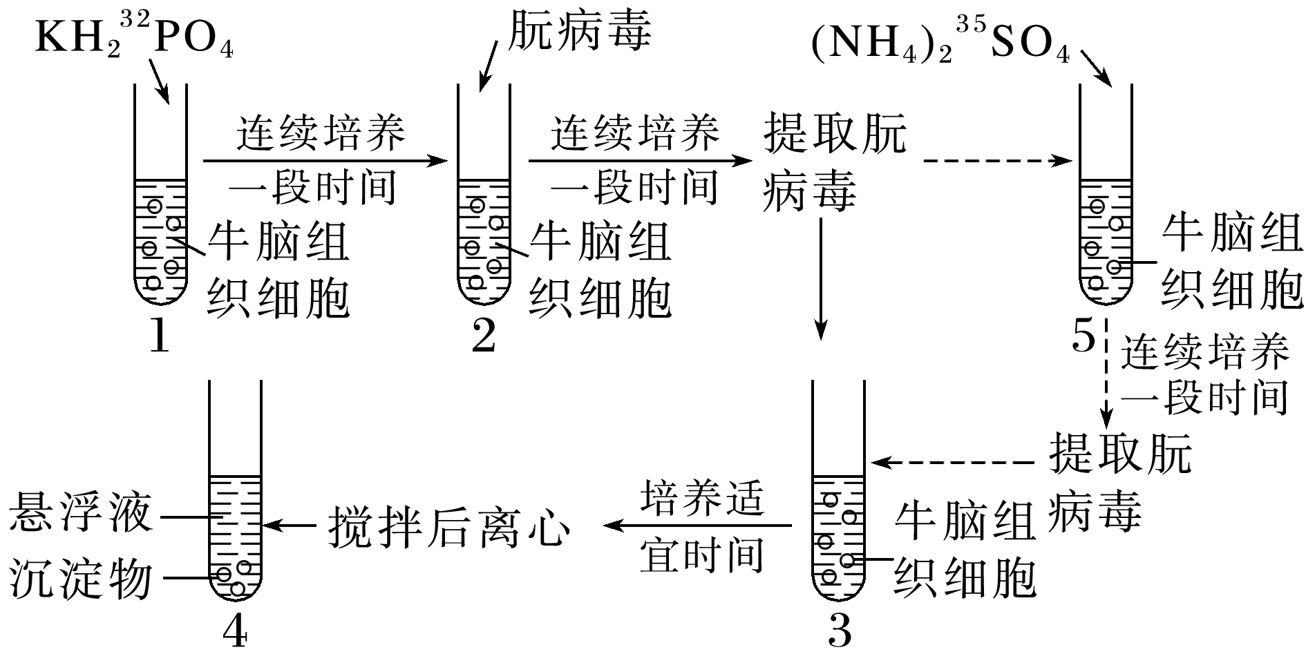 (1)由题图可知,本实验用32P和35S标记的朊病毒进行实验,采用了同位素标记特定物质的方法。图中搅拌的目的是将牛脑组织细胞和未侵入的朊病毒分开。(3)按照(2)的推测,由于朊病毒不含核酸,只含蛋白质,蛋白质中的磷含量极低,故试管2中提取的朊病毒几乎不含32P,因此,从理论上讲,离心后试管4的悬浮液中几乎不能检测到32P,沉淀物中也几乎不能检测到32P。(4)朊病毒的蛋白质中含有S元素,如果添加试管5,从试管2中提取朊病毒后先加入试管5,连续培养一段时间后,再提取朊病毒并加入试管3,朊病毒的蛋白质中含有35S,培养适宜时间后离心,由于朊病毒的蛋白质是侵染因子,35S随朊病毒侵入牛脑组织细胞,离心后放射性应主要位于牛脑组织细胞中,即沉淀物中;少量的朊病毒不能成功侵入牛脑组织细胞,离心后位于悬浮液中。