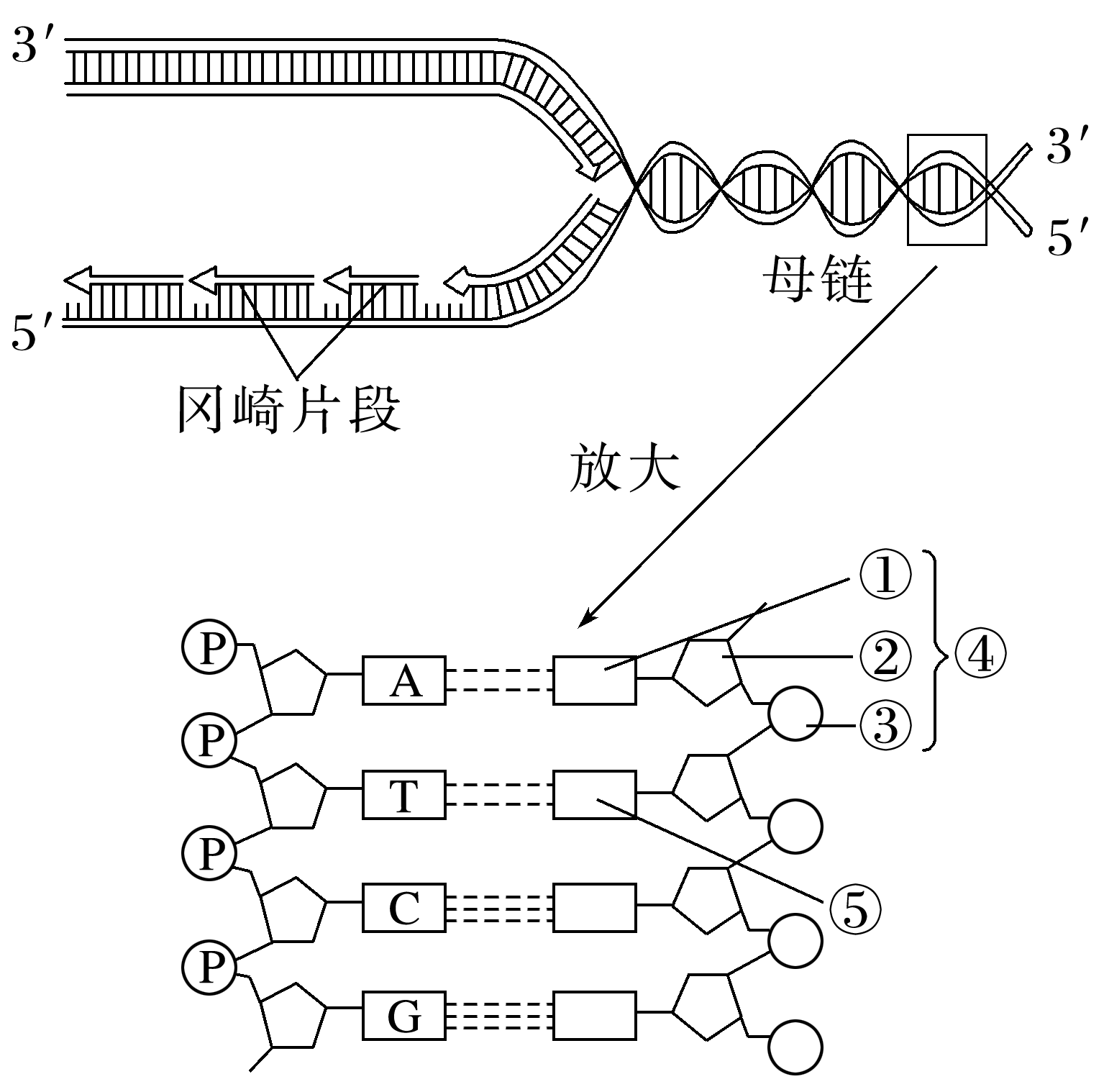 (1)图中①是碱基T,与A配对,④是由①胸腺嘧啶、②脱氧核糖和③磷酸基团构成的,是胸腺嘧啶脱氧核苷酸。(2)DNA复制过程中需要解旋酶破坏氢键,使DNA双链解开,之后需要DNA聚合酶作用将单个脱氧核苷酸连接成片段。(3)图中体现了DNA分子复制具有半保留复制、边解旋边复制和不连续复制的特点;合成两条子链时,子链延伸方向为5′→3′。