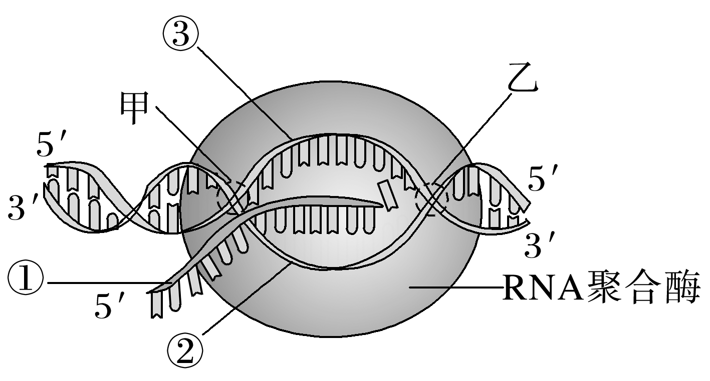 (1)根据分析可知,图示表示人体细胞内的转录过程,发生的场所是细胞核和线粒体,直接产物①是RNA。(2)翻译的直接模板是mRNA,而mRNA是以DNA的一条链为模板转录形成的,以DNA分子中的一条链5′—TTACATGCA—3′为模板转录形成的mRNA的碱基序列为5′-UGCAUGUAA-3′,其中第一个密码子(UGC)对应的反密码子为ACG,编码的氨基酸为b,第二个密码子(AUG)对应的反密码子为UAC,编码的氨基酸为c,第三个密码子(UAA)对应的反密码子为AUU,编码的氨基酸为a,所以该蛋白质基本组成单位的排列可能是b-c-a。(3)分析题图可知,转录形成的RNA链的延伸的方向是由甲向乙。转录发生在细胞核内,翻译发生在细胞质的核糖体上,正常情况下,RNA需在细胞核中加工成熟后经核孔进入细胞质,与核糖体结合进行翻译过程。(4)DNA的两条链是互补的,产生的mRNA是不同的,翻译形成的多肽链也不相同,故如果该DNA分子片段的两条链都能表达蛋白质,产生的多肽链不相同。