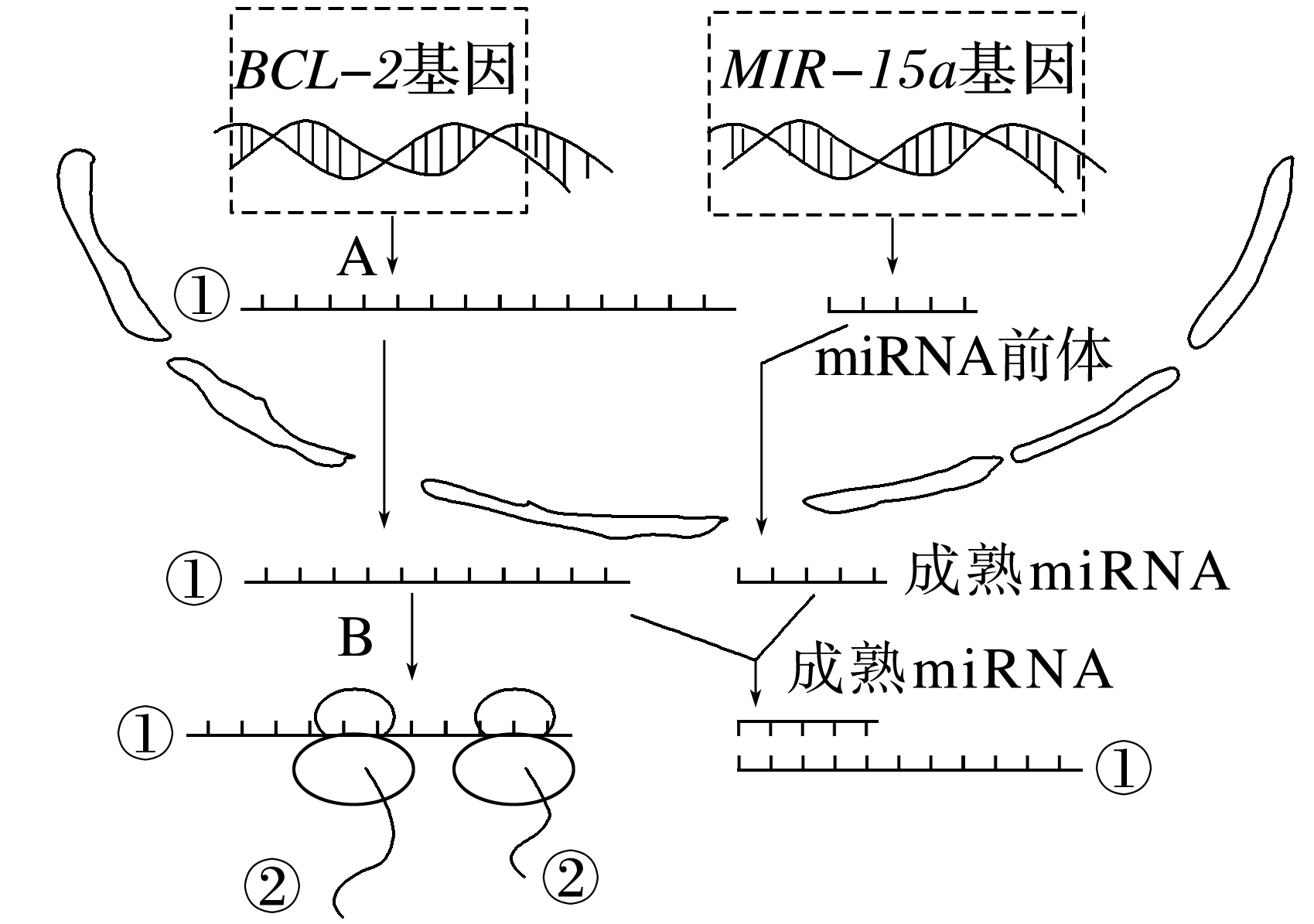 (2024·浙江台金七校高一期中)miRNA是真核细胞中一类不编码蛋白质的短序列RNA,其主要功能是调控其他基因的表达。研究发现,BCL-2是一个抗凋亡基因,其编码的蛋白质有抑制细胞凋亡的作用。该基因的表达受MIR-15a基因控制合成的miRNA调控,如图所示。请分析回答下列问题: