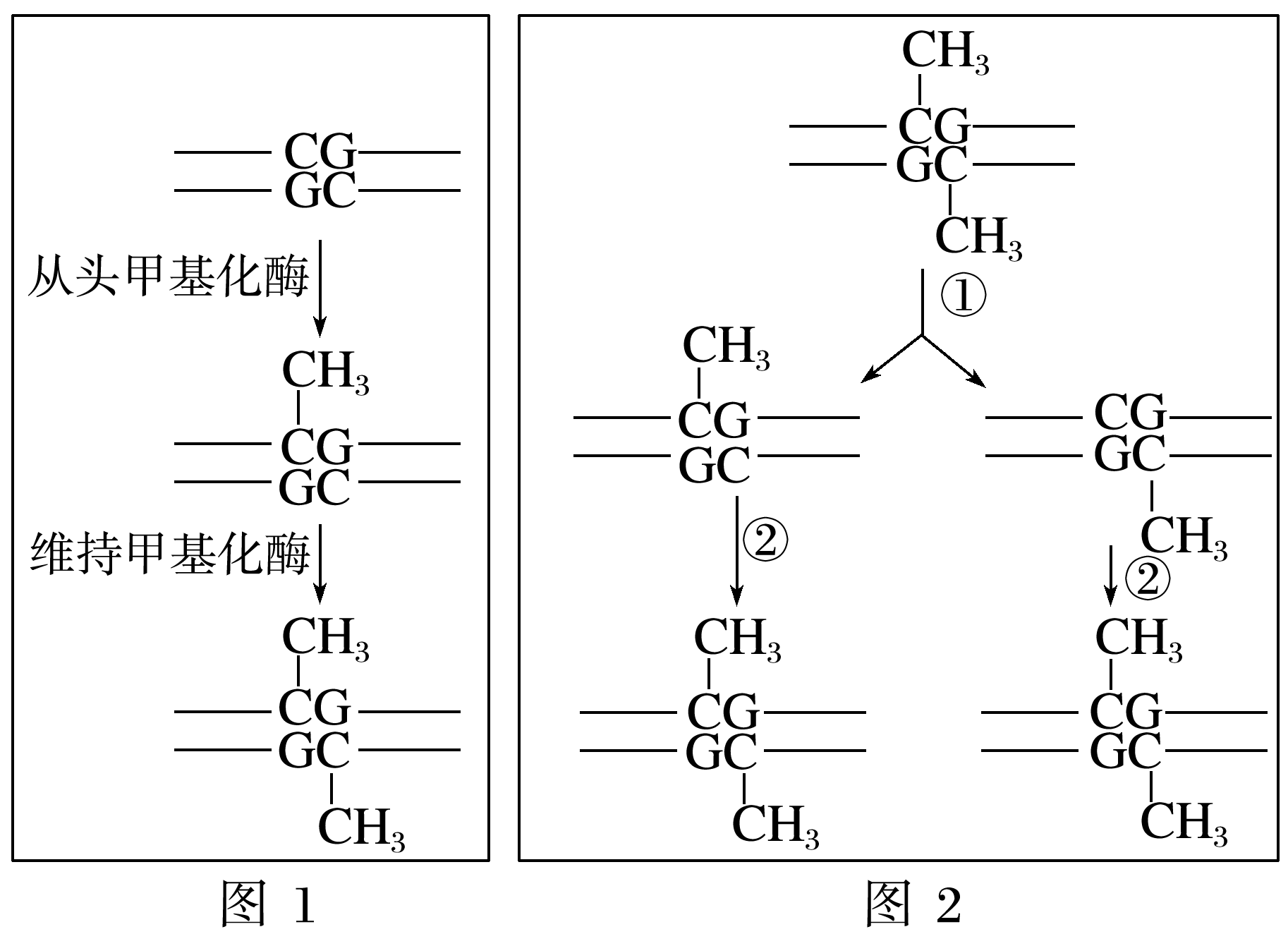 (2)由于图2中过程①的方式是____________,所以其产物都是______甲基化的,因此过程②必须经过____________________的催化才能获得与亲代分子相同的甲基化状态。
