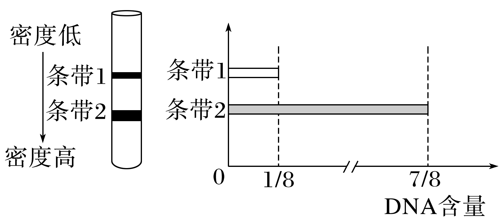 (2024·浙江七彩阳光联盟高一期中)研究人员将1个含14N—DNA的大肠杆菌转移到以15NH4Cl为唯一氮源的培养液中,培养24 h后提取子代大肠杆菌的DNA,然后进行密度梯度离心,试管中出现两种条带(如图)。下列说法错误的是( )