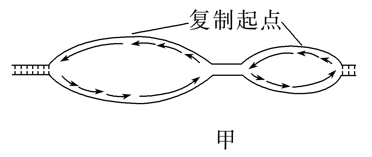 图甲中进行多起点复制,表示DNA复制;图乙以mRNA为模板合成蛋白质,表示翻译过程;图丙以DNA的一条链为模板合成mRNA,表示转录过程。一个DNA复制得到2个DNA,通过增加复制起点,细胞可以缩短复制的时间,A错误;若干个核糖体串联在一个mRNA分子上,可以同时翻译多条相同肽链,大大提高翻译效率,B错误;以DNA为模板、4种游离的核糖核苷酸为原料转录得到RNA,C错误。