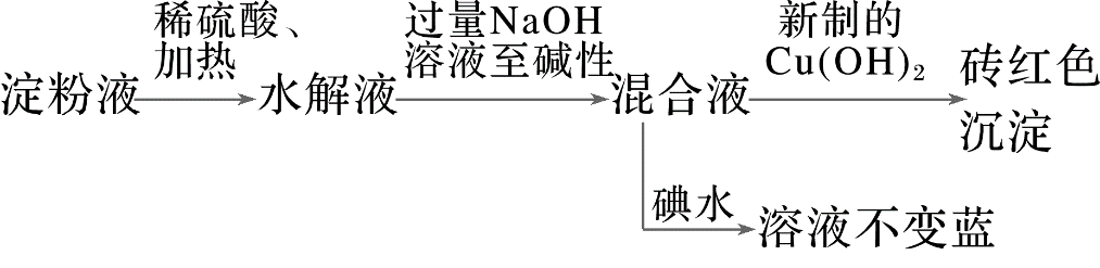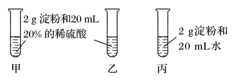 (3)试管甲和乙均加入2 g淀粉和20 mL 20%的稀硫酸,试管甲用60~80 ℃的水浴加热5~6 min,试管乙不加热,所以设计甲和乙是为了探究温度对淀粉水解的影响;试管丙加入2 g淀粉和20 mL水,与甲对比,未加20 mL 20%的稀硫酸,试管甲和丙均用60~80 ℃的水浴加热5~6 min,所以设计甲和丙是为了探究催化剂对淀粉水解的影响。