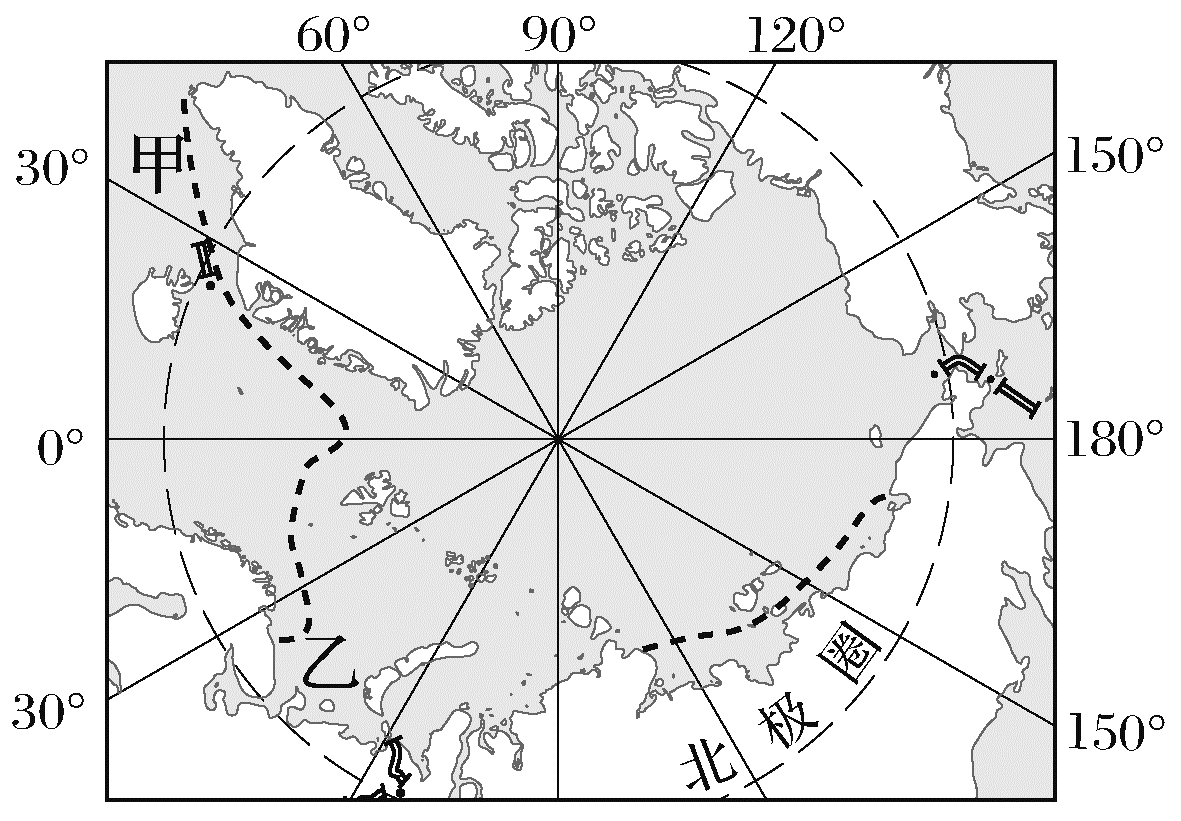 最新研究显示,气候变化导致近10年全球冰盖融化速度是20年前的6倍。如图中虚线为北冰洋某月部分海区冰盖分布南界。完成11~12题。