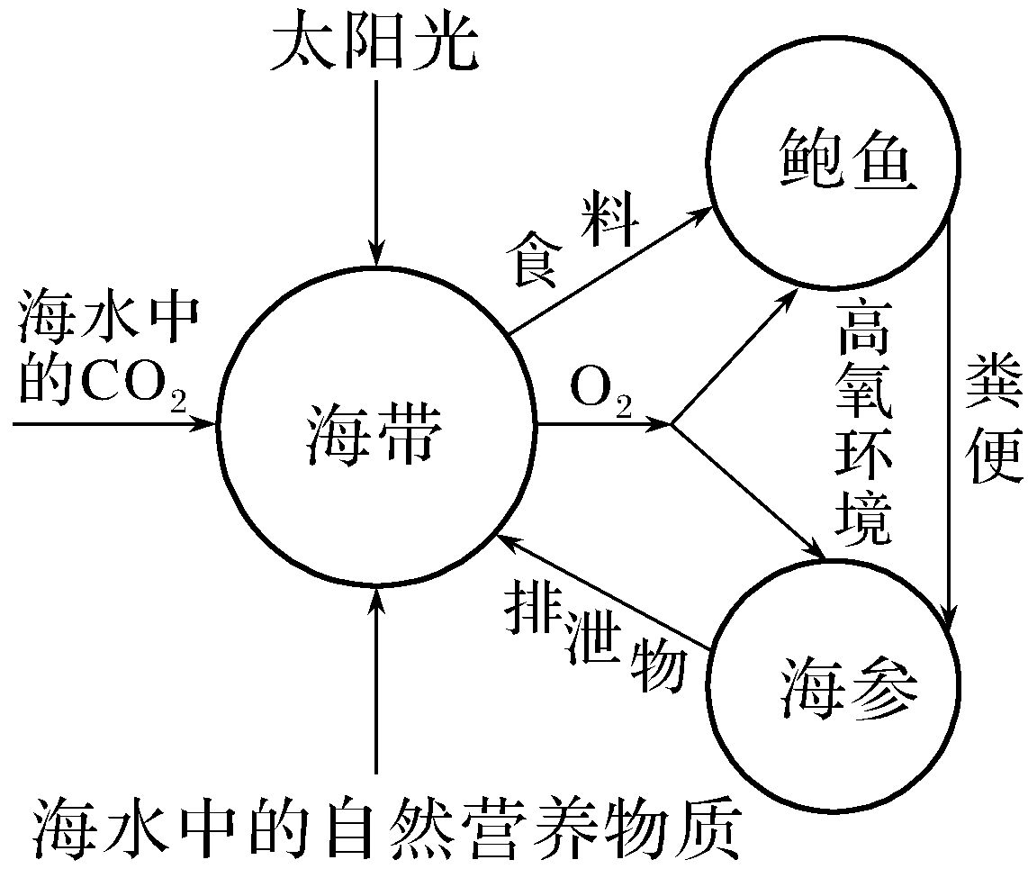由材料可知,该混合养殖模式实现了废弃物的循环利用,海带可以作为鲍鱼的食物,鲍鱼的粪便成为海参的食物,海参排泄物可以为海带生长提供肥料,从而减少了肥料的使用,同时减少了废弃物的排放,减少了海洋污染,C正确。