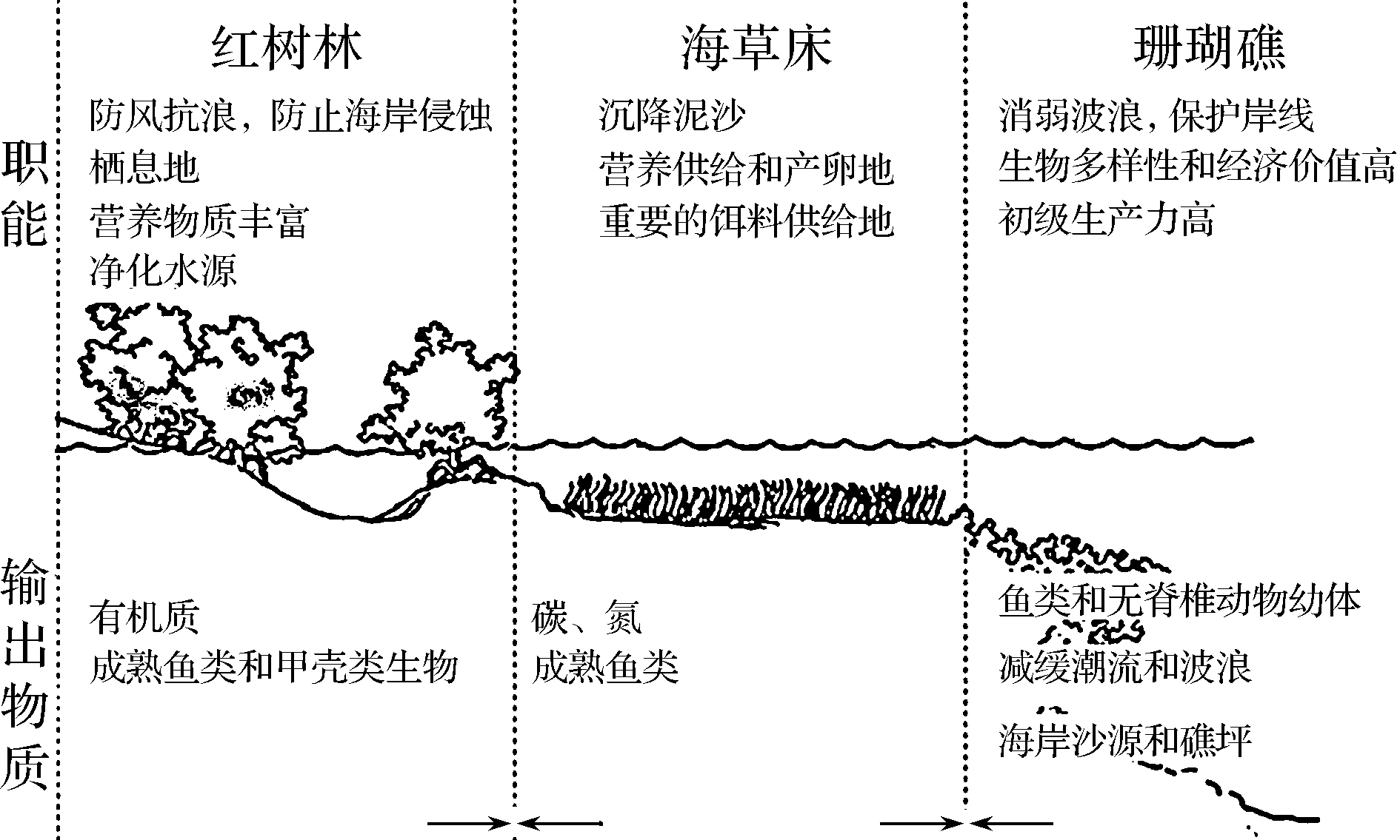 据图分析,海草床能为鱼类提供良好的栖息地和隐蔽保护场所,降低被捕食概率,同时是重要的饵料供给地,提供丰富的营养物质,从而输出成熟鱼类,A、B正确;削弱波浪是珊瑚礁的功能,C错误;固碳量大,缓解全球变暖与输出成熟鱼类关系不大,D错误。