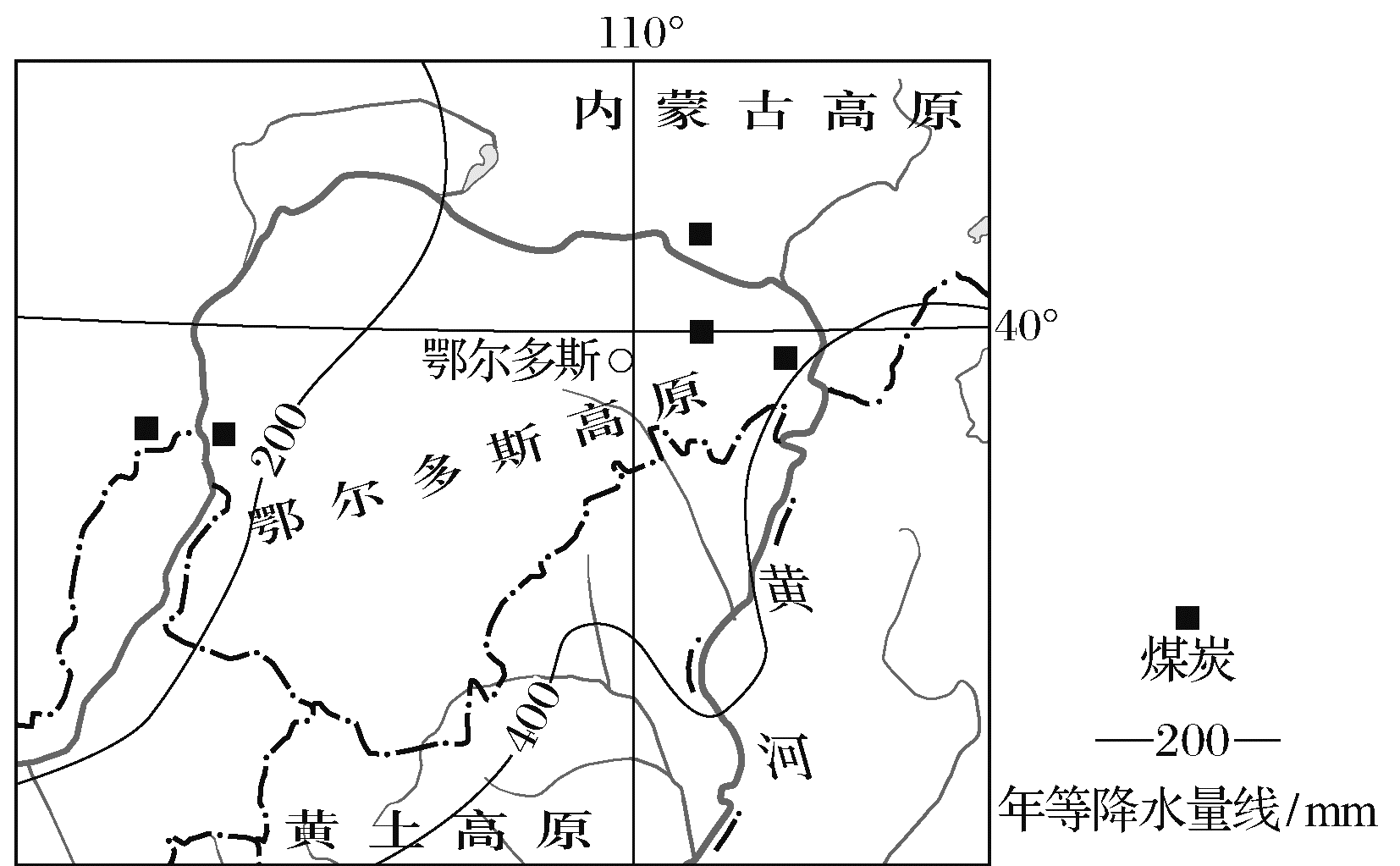 鄂尔多斯是我国重要的能源基地,也是我国生态脆弱地区之一。能源消费以化石能源为主,煤炭比重高。近年来,鄂尔多斯市积极推动煤炭产业转型升级,大力发展煤转油、煤制天然气、煤制烯烃等现代煤化工产业,同时推动传统能源向新能源、黑色能源向绿色能源、高碳能源向低碳能源转变。还着力打造风电、光伏、绿色氢能(由水电解而成)和储能产业链,以新能源发电带动新能源汽车等装备制造发展,构建“风光氢储车”产业集群,促进其经济发展。如图为“鄂尔多斯区域图”。