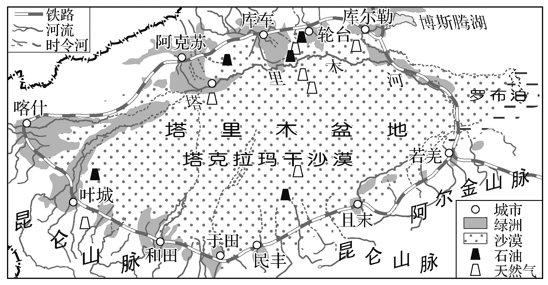 (2024·精诚联盟3月联考)如图为“塔里木盆地的绿洲与城镇分布图”。据此完成3~4题。