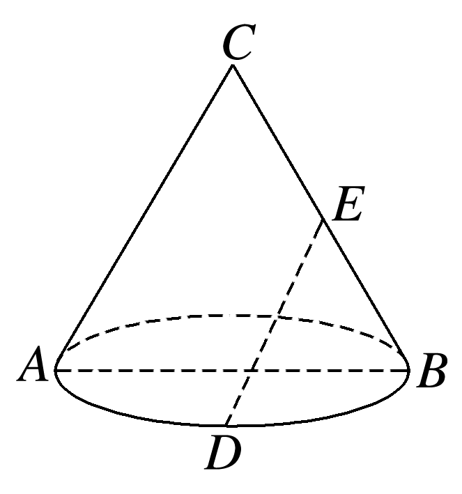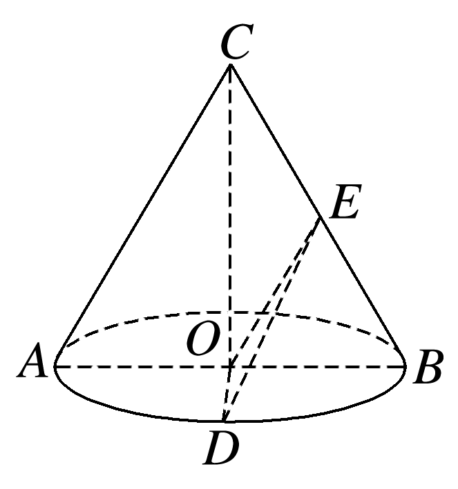 如图所示,圆锥底面半径为1,母线AC=2,D为弧AB的中点,E是BC的中点,则异面直线AC与DE夹角的正弦值是( )