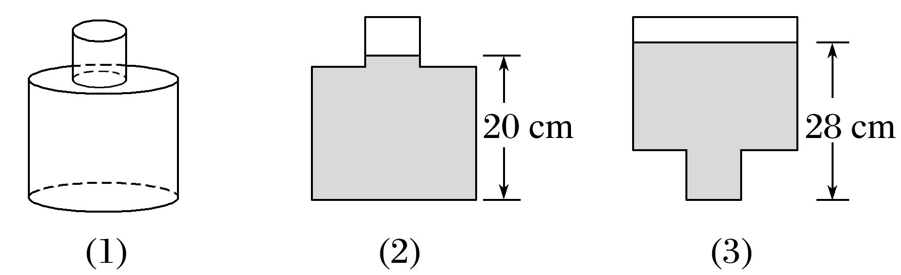 如图(1)所示,一个装了水的密封瓶子,其内部可以看成是由半径为1 cm和半径为3 cm的两个圆柱组成的简单几何体.当这个几何体如图(2)水平放置时,液面高度为20 cm;当这个几何体如图(3)水平放置时,液面高度为28 cm,则这个简单几何体的总高度为 cm.