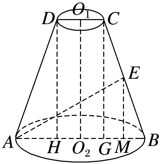 所以直线AE与圆台的上底面所成的角等于其与圆台的下底面所成的角.过点E作EM⊥AB于点M.易知∠MAE为直线AE与下底面所成的角即为所求的角.又AM=AB-MB=AB-BG=3-,EM=CG=DH=,