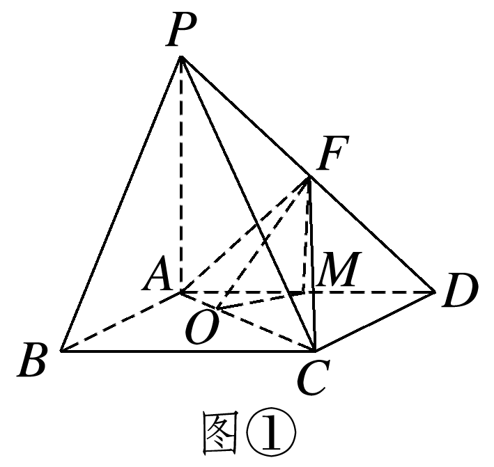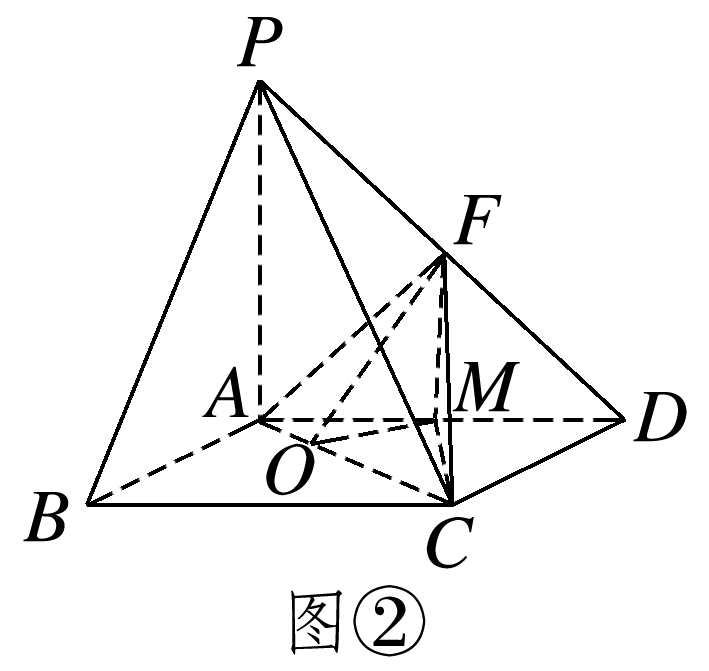 答案: 解 (1)在线段AB上存在中点G, 使得AF∥平面PCG.证明如下: 如图所示,连接PG,CG,设PC的中点为H,连接FH,GH, ∵FH∥CD,FH=CD, AG∥CD,AG=CD, ∴FH∥AG,FH=AG, ∴四边形AGHF为平行四边形,则AF∥GH. 又GH⊂平面PCG,AF⊄平面PCG, ∴AF∥平面PCG. (2)若选择条件①. 如图①,过点F作FM⊥AD于点M,过点M作MO⊥AC于点O,连接FO. ∵F为PD的中点,PA⊥平面ABCD, ∴FM∥PA,且FM⊥平面ABCD,又AC⊂平面ABCD,∴FM⊥AC. 又AC⊥MO,FM∩MO=M,FM,MO⊂平面FMO,∴AC⊥平面FMO,又FO⊂平面FMO, ∴AC⊥FO, ∴∠FOM为二面角F-AC-D的平面角. ∵AB⊥BC,四边形ABCD为正方形, ∴∠CAD=,∴MO=AMsin . 又FM=PA=1. ∴cos∠FOM=, 即二面角F-AC-D的余弦值为. 若选择条件②. 与选择条件①一样作相同的辅助线, 如图②,连接MC. ∵FC与平面ABCD所成的角为,∴∠FCM=, ∴MC=. ∴MC2+MD2=CD2,∴CM⊥AD. ∴在Rt△AMC中, MO=. ∴cos∠FOM=. 若选择条件③. 与选择条件①一样作相同的辅助线. ∵∠ABC=,∴∠DAC=, ∴MO=AMsin. ∴cos∠FOM=.