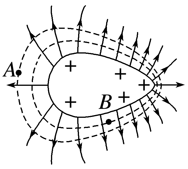 电场强度的方向由高电势指向低电势,故避雷针带正电,A正确;根据电场线与等势面垂直,可知A、B两点的电场强度方向不同,B错误;由WAC=qUAC=q(φA-φC),根据q>0,φA>φC,可知正电荷从A移动到C点, 该过程静电力做正功,C错误;负电荷在电势低的地方电势能大,因为φA>φC,故负电荷在C处电势能大,D错误。