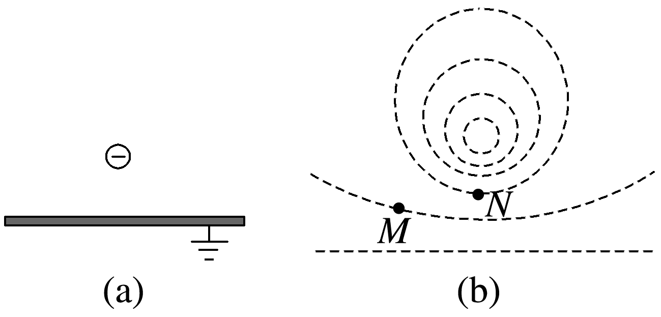(2021·全国乙卷)如图(a),在一块很大的接地金属平板的上方固定一负电荷。由于静电感应,在金属平板上表面产生感应电荷,金属板上方电场的等势面如图(b)中虚线所示,相邻等势面间的电势差都相等。若将一正试探电荷先后放于M和N处,该试探电荷受到的静电力大小分别为FM和FN,相应的电势能分别为EpM和EpN,则( )