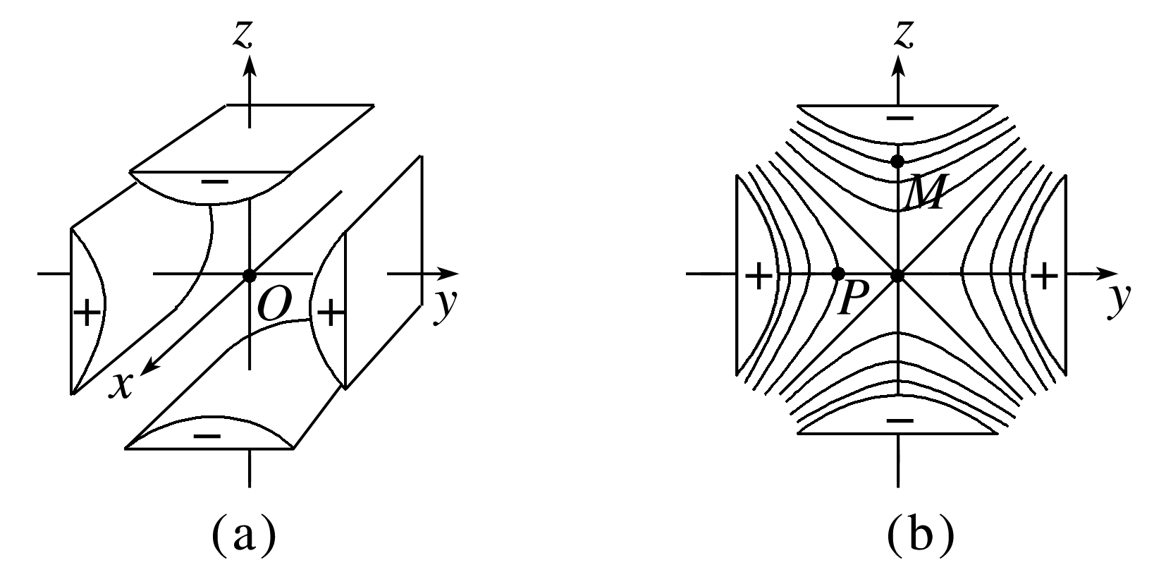 (多选)(2023·辽宁卷)图(a)为金属四极杆带电粒子质量分析器的局部结构示意图,图(b)为四极杆内垂直于x轴的任意截面内的等势面分布图,相邻两等势面间电势差相等,则( )