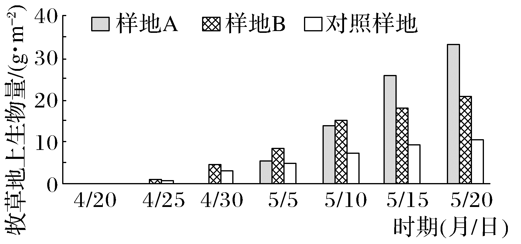 我国内蒙古中部某地区50多年来,年年植树,但因成活率低,目前森林覆盖率不到1%。实践证明,在该区域进行生态建设,种草的效果更好。某学校课外活动小组为了研究不同厚度的积雪融化后对牧草生长量的影响,选了一块试验地。根据积雪厚度设计了同面积的两种样地和一个对照样地。样地A:积雪厚度30 cm;样地B:积雪厚度10 cm;对照样地:无积雪区(通过人工处理)。如图为“一段时期的实验结果对比图”。据此完成7~8题。