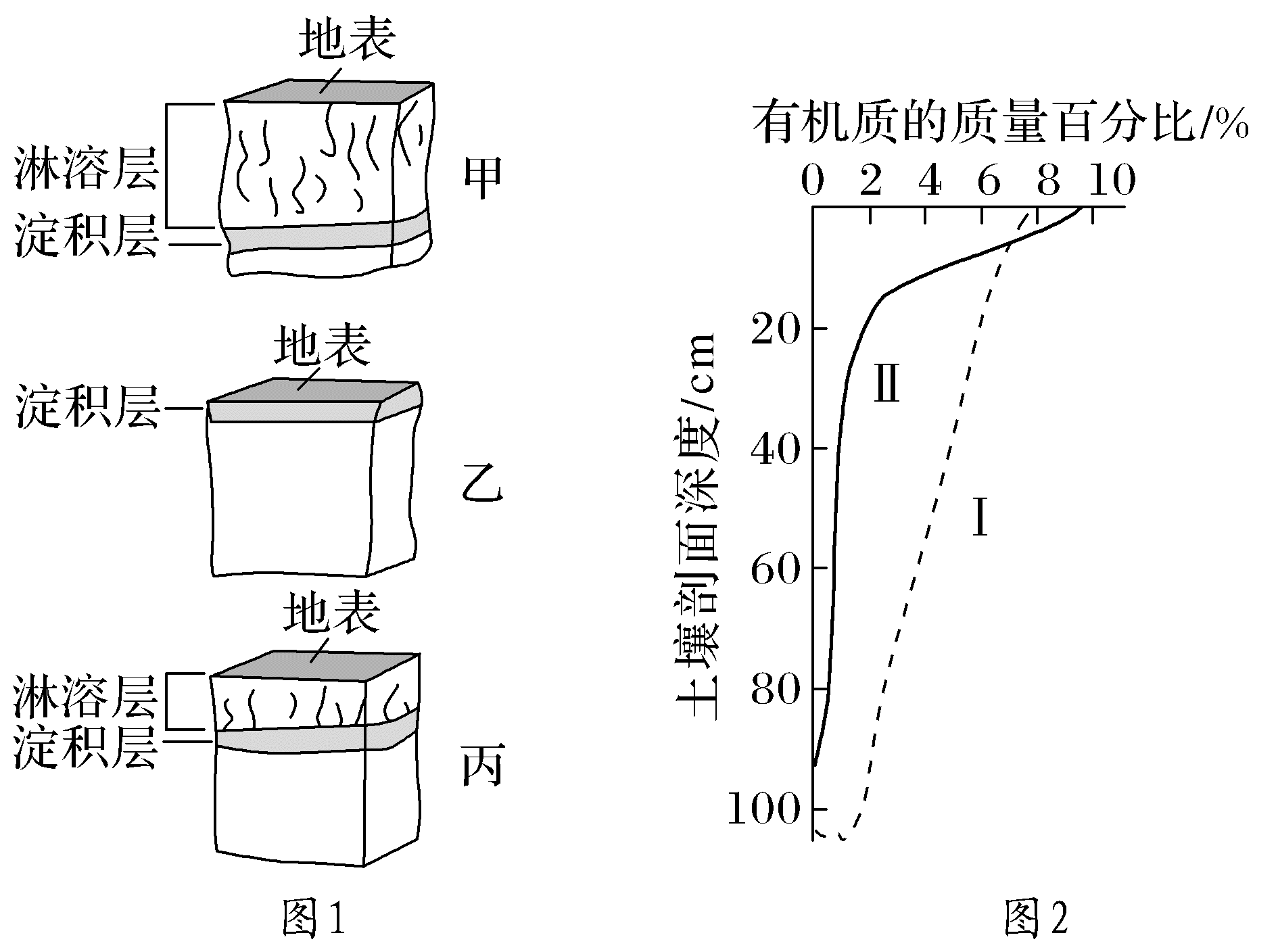 由材料可知,土壤的淋溶作用与降水有着直接的关系,降水越多,淋溶层越厚。因此湿润地区的淋溶层最厚,半干旱区次之,干旱区最薄。由此判断:图甲的淋溶层最厚,是森林土壤;图乙的没有淋溶层,且淀积层薄,是荒漠土壤;图丙的淋溶层的厚度居中,应该属于半干旱地区,其对应的典型植被为草原。草原根系茂密且集中在近地表的土壤中,向下则根系的集中程度递减,从而为土壤表层提供了大量的有机质,因此有机质主要分布在土壤的表层,对应右图中的Ⅰ。综上分析,故选D。