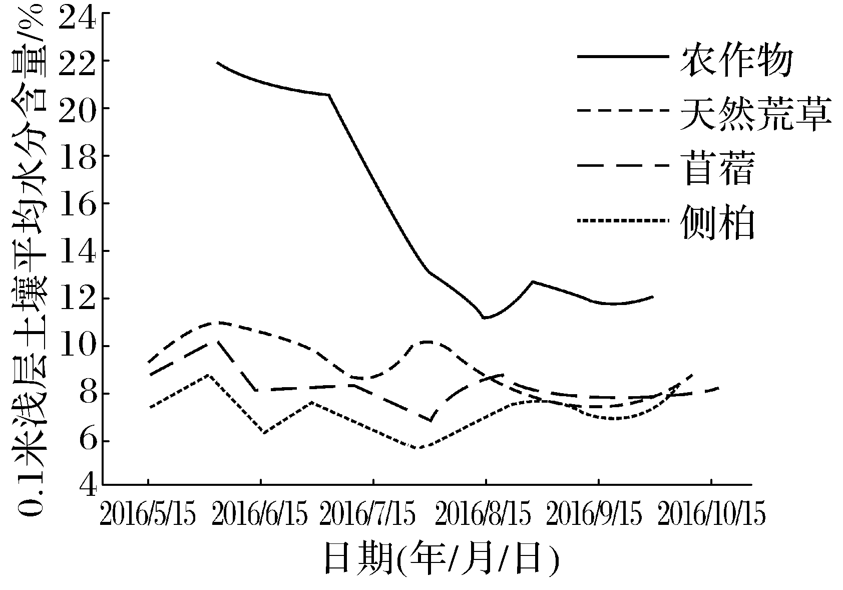我国甘肃某地位于半干旱黄土丘陵区,年均降水量386毫米,年均潜在蒸发量1 439毫米。如图示意该地不同植被类型土壤含水量变化状况。不同植被类型土壤样地均位于梁顶,地形、降水量等环境特征较为一致。据此完成17~18题。