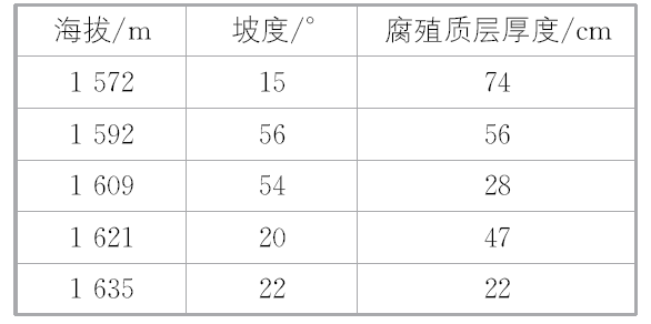 阅读表格,该地海拔1 572米处的腐殖质厚度最大。推测可能原因是:此处海拔较低,地形坡度更小,流水冲刷作用弱,腐殖质流失少,利于腐殖质积累,C、D正确。