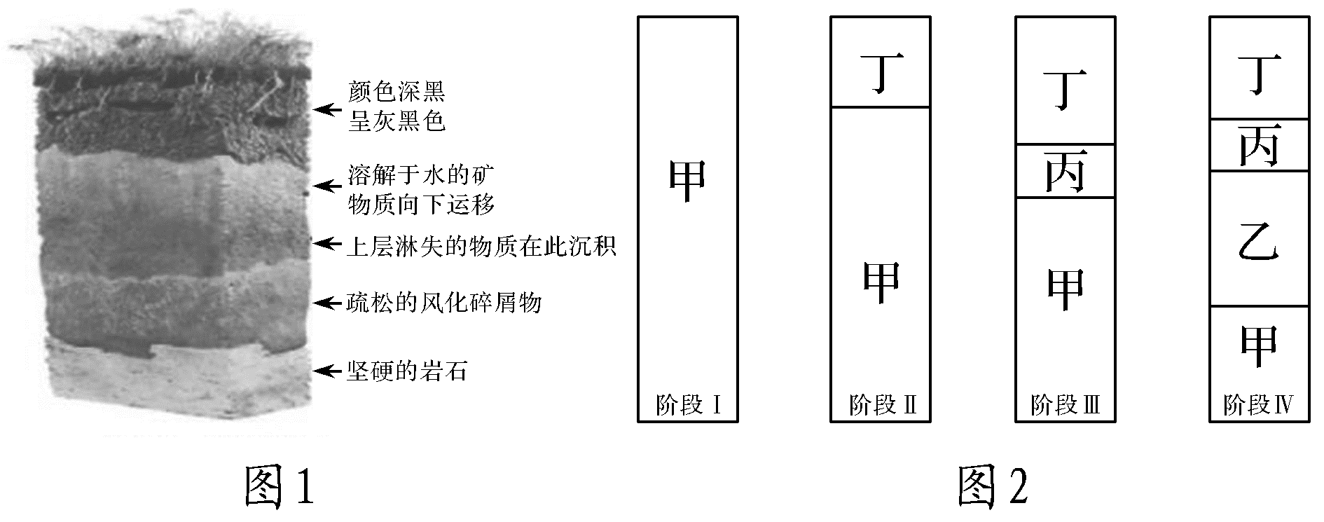 (2023·宁波九校高一期末)图1为土壤剖面的各层特点描述,图2为某同学依据所学知识绘制的土壤发育阶段序列。据此完成24~25题。