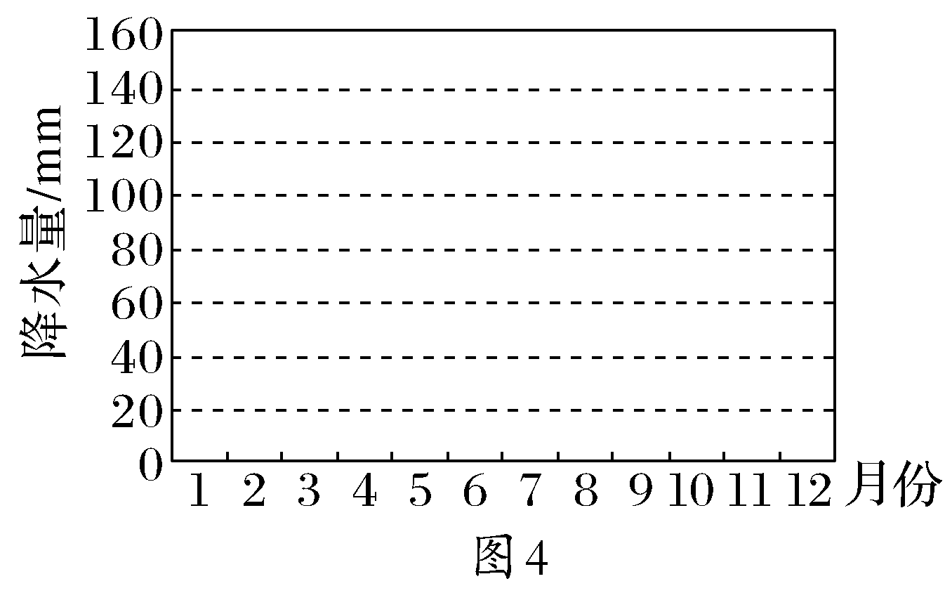 (1)在图4中绘制出甲地降水量统计图。下列生活用品中,该同学在甲地附近旅游时需优先准备的是________和________。(4分)