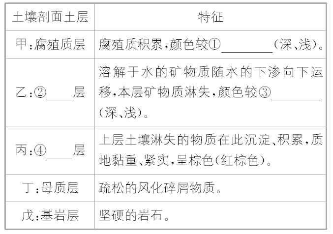 答案: (1)深 淋溶 浅 淀积 (2)岩石风化 有机质 (3)草地有机质含量大于森林土壤。草类根系发达,为土壤提供有机质多;森林土壤降水量大,有机质冲刷强;森林的生产力强,吸收消耗有机质多。