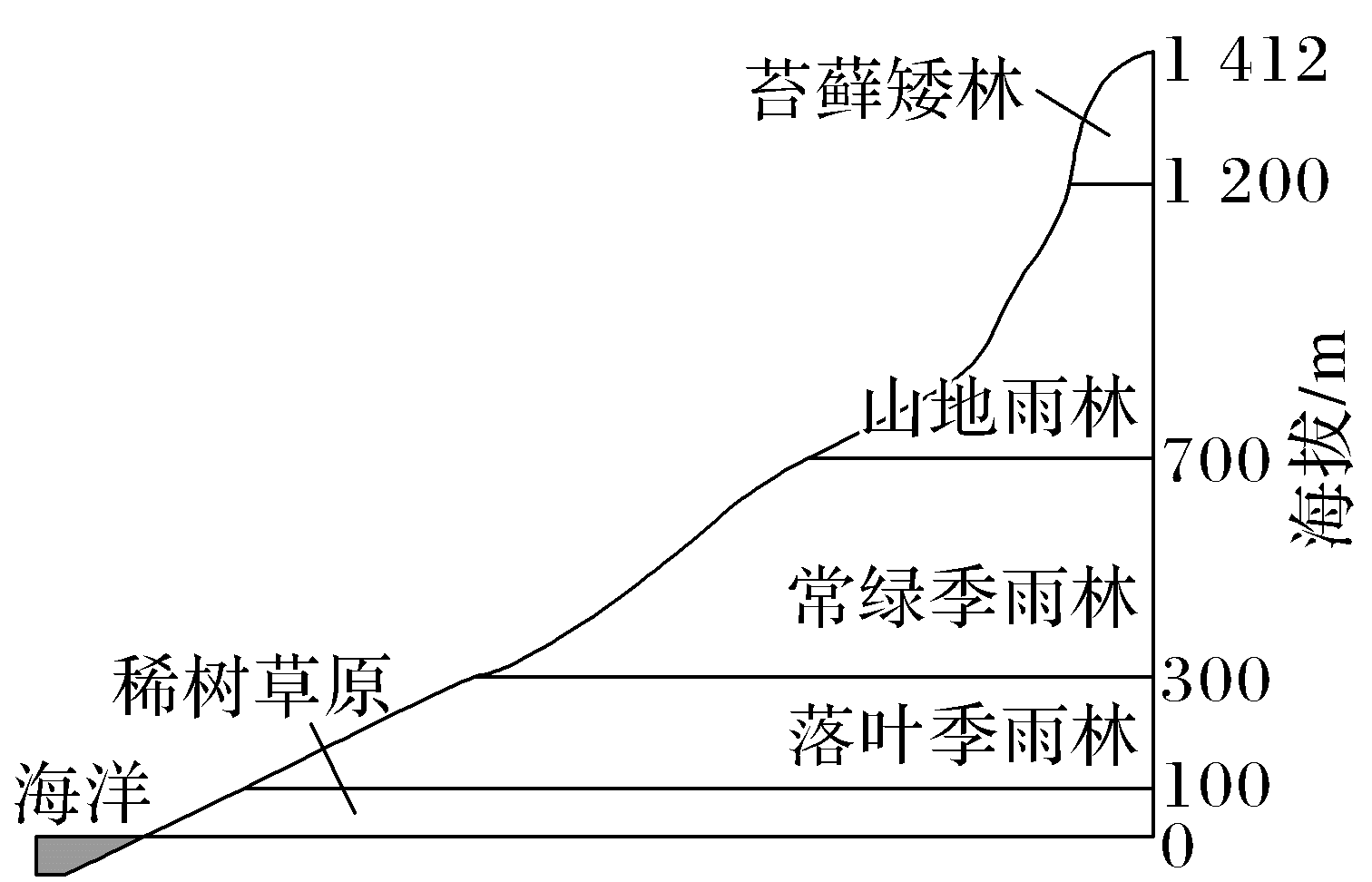 (2024·北斗联盟高一期末)湿润气流遇到山脉等高地阻挡时被迫抬升形成降水。尖峰岭国家森林公园位于海南岛,是我国现存面积最大、保存最完整的热带原始森林。如图为“尖峰岭森林类型垂直剖面分布示意图”。完成3~4题。
